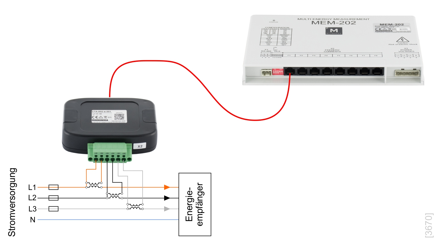Nachfolgend sind zwei Beispiele für den Anschluss des verwendeten Adapters mit einem Stromwandler und einem Messgerät MEM-202 (Abb. 1) sowie mit einem dedizierten RTU DA2 MST-Controller (Abb. 2) aufgeführt.   []