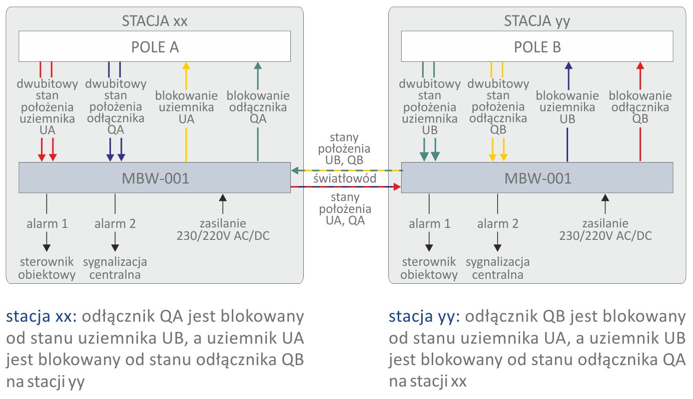 Moduł blokad wzajemnych MBW-xxx jest przeznaczony do realizacji wzajemnych blokad stacyjnych i międzystacyjnych. Współpracuje z analogicznym urządzeniem w oddalonej lokalizacji i może realizować blokowanie zadziałania odłączników od stanu uziemników na stacjach energetycznych oddalonych od siebie do 80 km. Urządzenie składa się z bloku 4 separowanych galwanicznie wejść dwustanowych na napięcie 220V lub 24V DC lub 4 wejść przekaźnikowych na napięcie 220V DC oraz ze światłowodowego bloku komunikacyjnego.