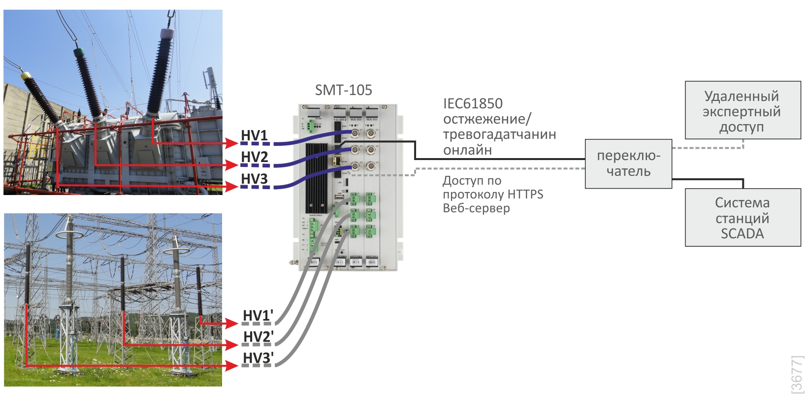 Модуль мониторинга изоляторов SMT-105 представляет собой специализированное измерительное устройство с функциями записи, предупреждения и сигнализации. Система предназначена для мониторинга до 6 изоляторов, или, в других вариантах, до 8 изоляторов, установленных в сетевых и блочных силовых трансформаторах.